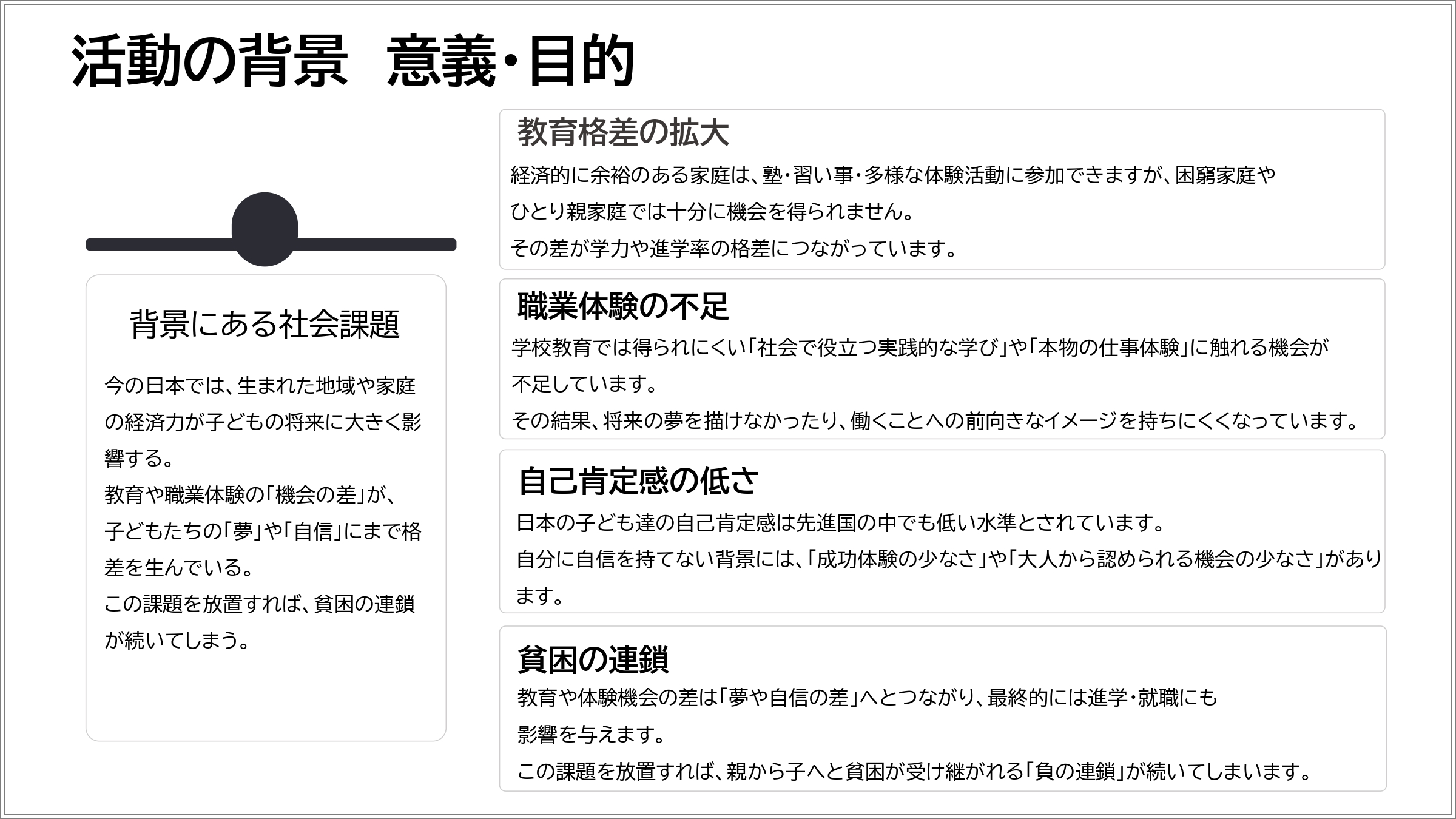 次の日本を担う人材を幼少期から育て、社会に送り出すことで経済・社会の発展に寄与し、世の中をもっと元気にできる更に次世代の人材を育てたいと思っています。しかし、まだまだ力が足りないのも現状です。皆様の協賛を何卒よろしくお願いいたします。