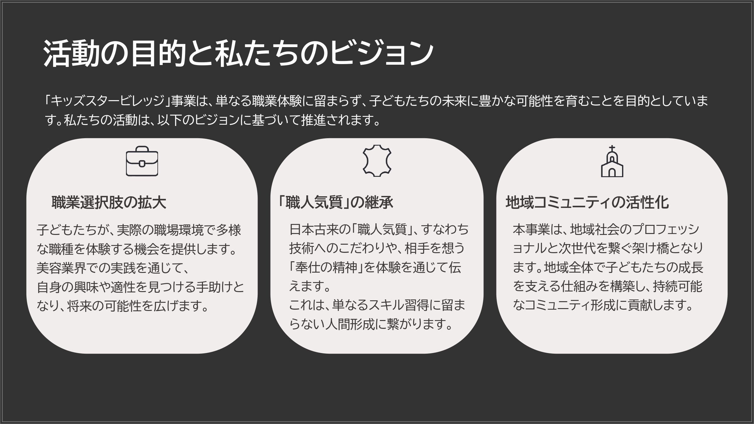 楽しみながらの職業体験を通して、子どもたちが社会で活躍する楽しさを学び、自立性を養うことを目的にしています。