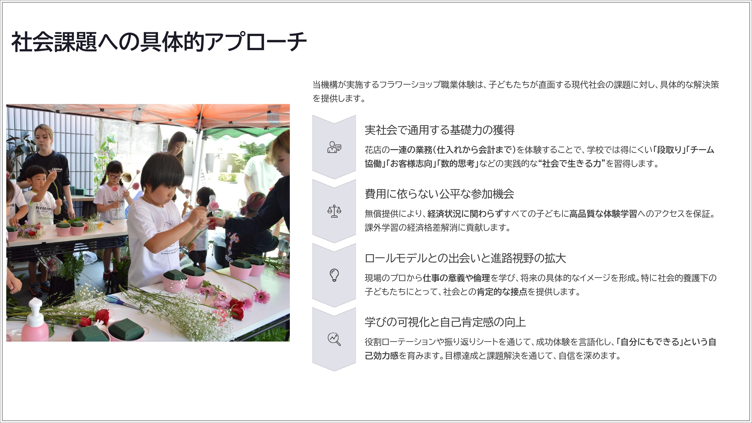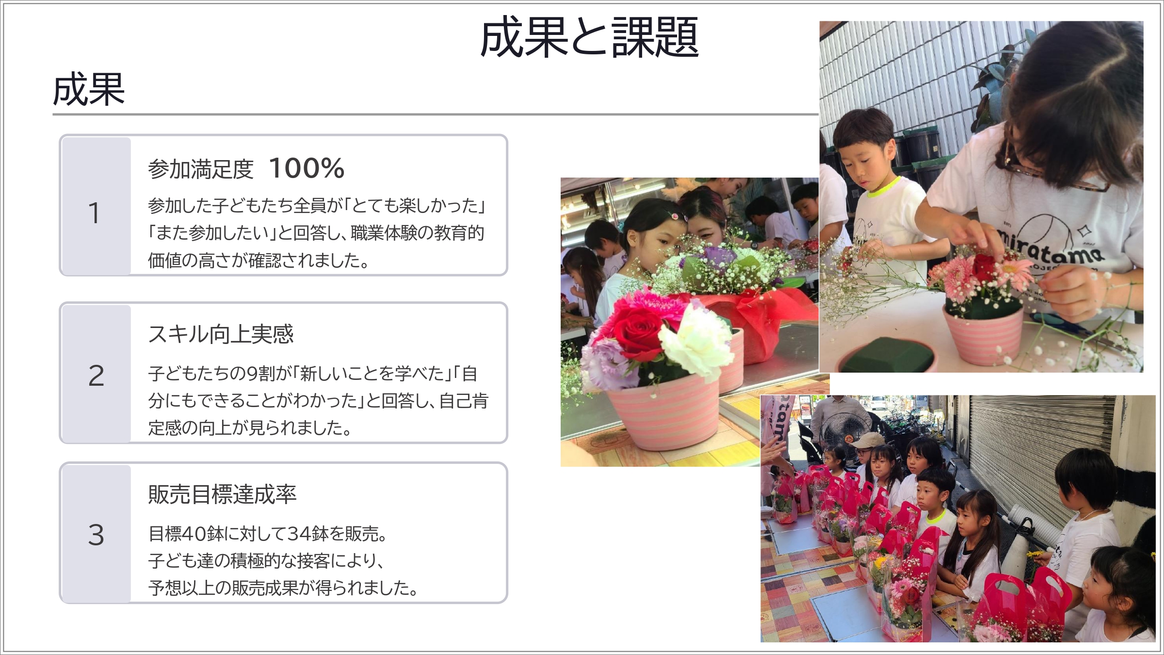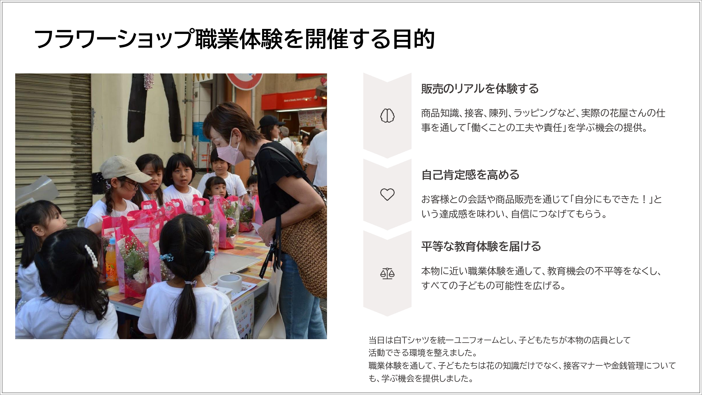 「フラワーショップ職業体験」では、自分で選んだ花を一つの鉢にして「オリジナル」の商品を作り、それを自分たちで店頭でお客様に販売します。商品を作ることで、「アイデア」が生まれ、商品を販売することや接客によって「コミュニケーション能力の向上」「ルールやマナー」を学ぶことが出来ます。子どもたちがそのような体験を通して、社会で活躍する楽しさやお金を稼ぐことの大変さを学び、自立性やコミュニケーション力を養うことを目的にしています。