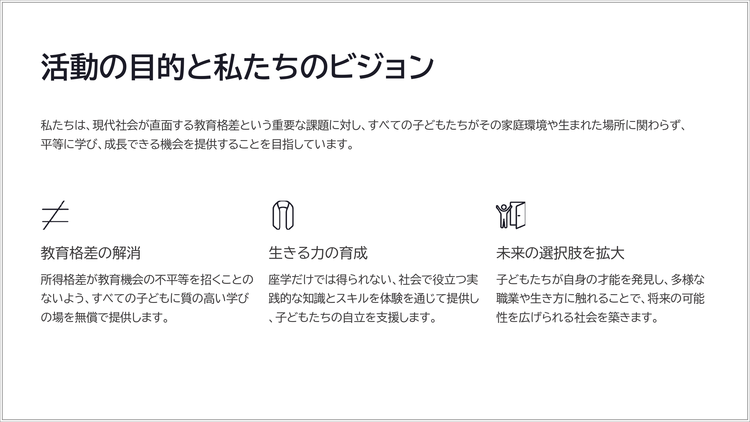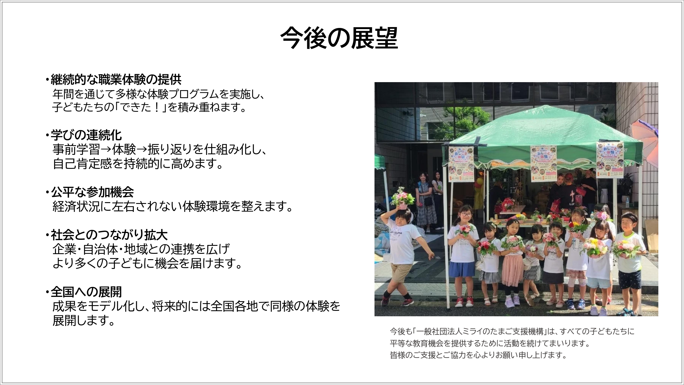 私たち一般社団法人ミライのたまご支援機構は、子ども達に「教育・体験」を支援しています。