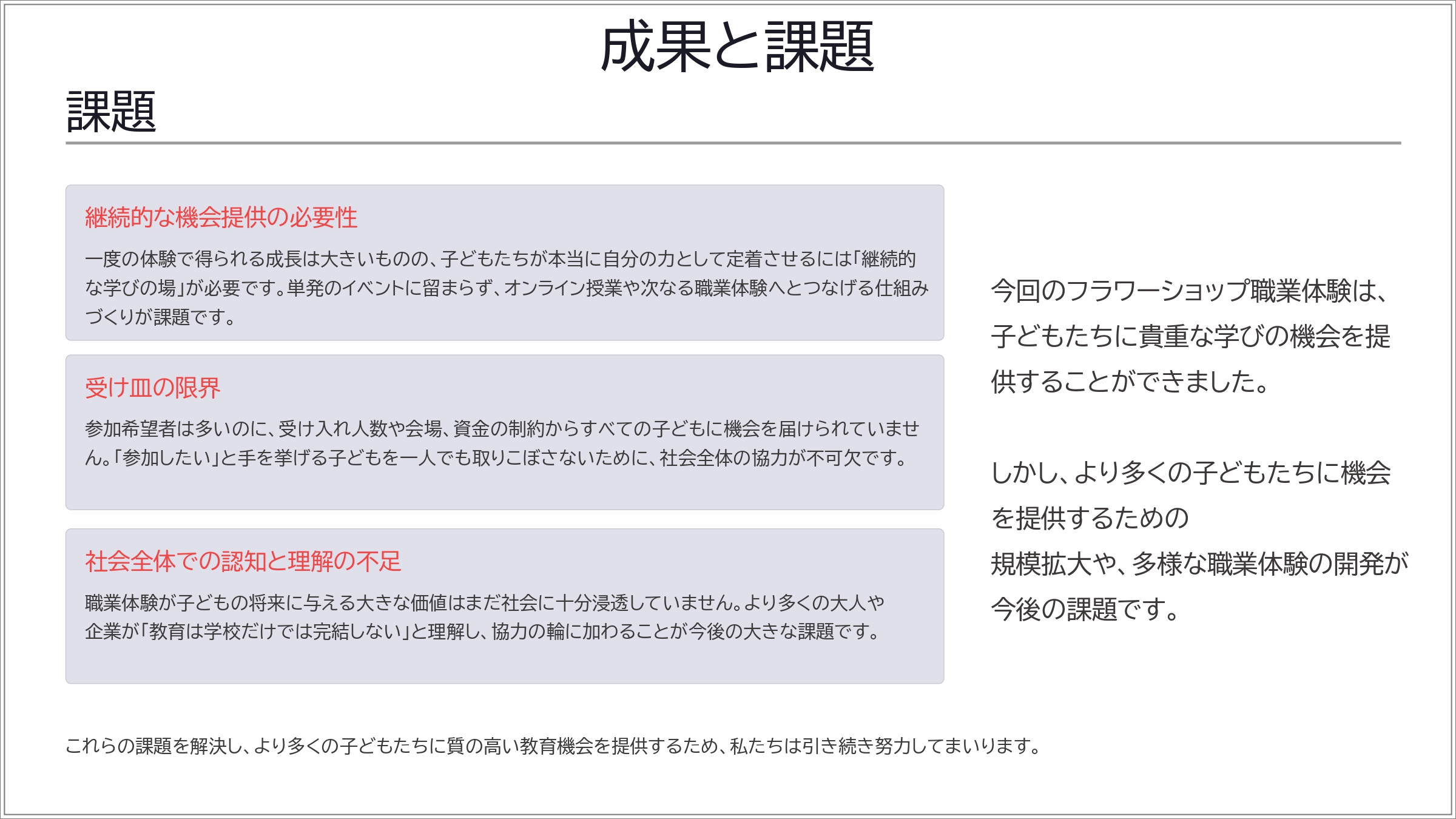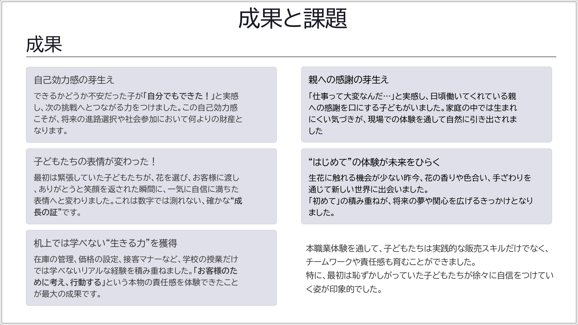 最初は初めてのことに緊張していた子どもたちですが、自分が作ったものを売って「お給料」をもらう体験をして、帰る頃には達成感で溢れた表情になっていました。